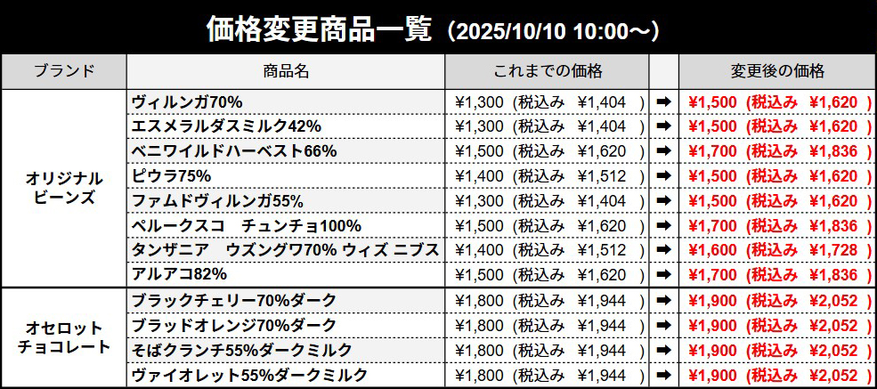 この度、弊社で取り扱っている「オリジナルビーンズ」「オセロットチョコレート」の一部チョコレート製品につきまして、昨今の世界情勢やカカオの価格高騰による物流コストの大幅な増加や円安に伴い、価格を改定することとなりました。