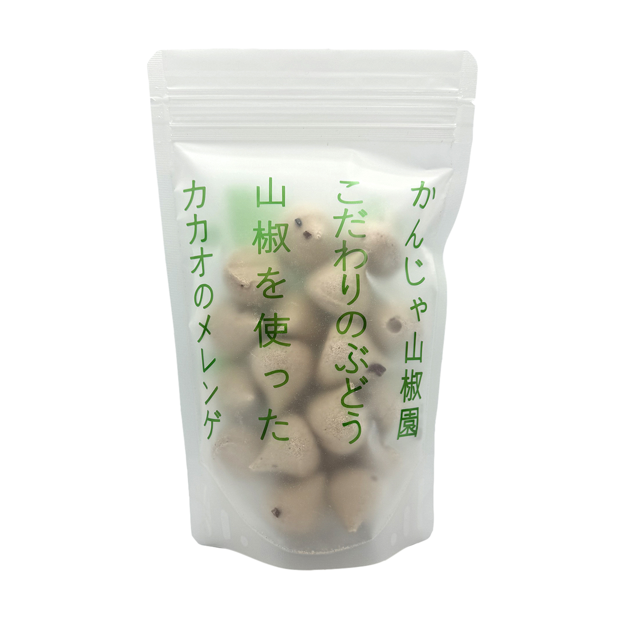 和歌山県の有田川に沿った山間部にあるかんじゃ山椒園のぶどう山椒と、ベトナムベンチェ省のカカオを使用したエリタージュのカカオパウダーとカカオニブを使用したサクサクと軽い食感のメレンゲ菓子です。