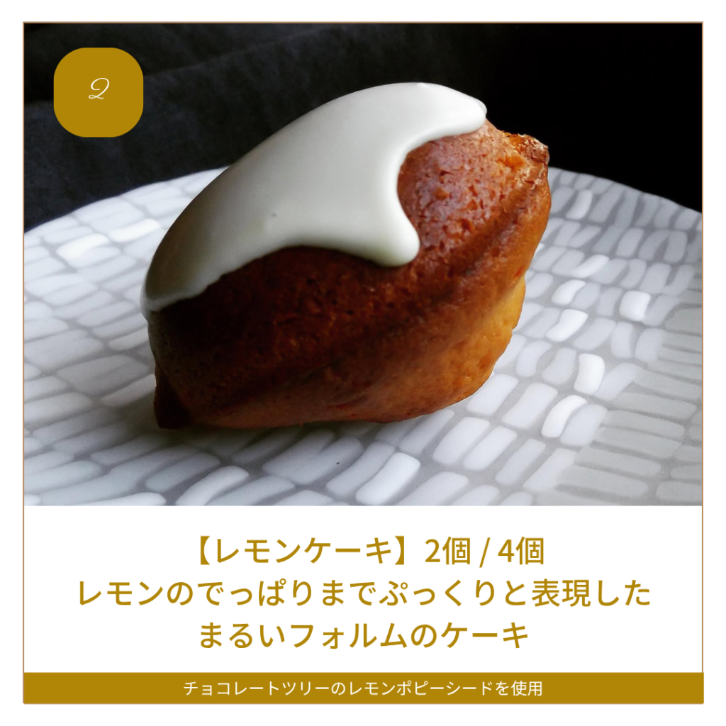 mayumimadeさん特製のレモンのでっぱりまでぷっくりと表現したまるいフォルムのケーキ。ケーキの上にはチョコレートツリーのホワイトチョコレートベースのレモンポピーシードをかけました。ホワイトチョコレートがこっくり、ケーキはぎゅっとみっちりな食感で、バターのコクを感じた後にレモンの爽やかさがふわっと香ります。