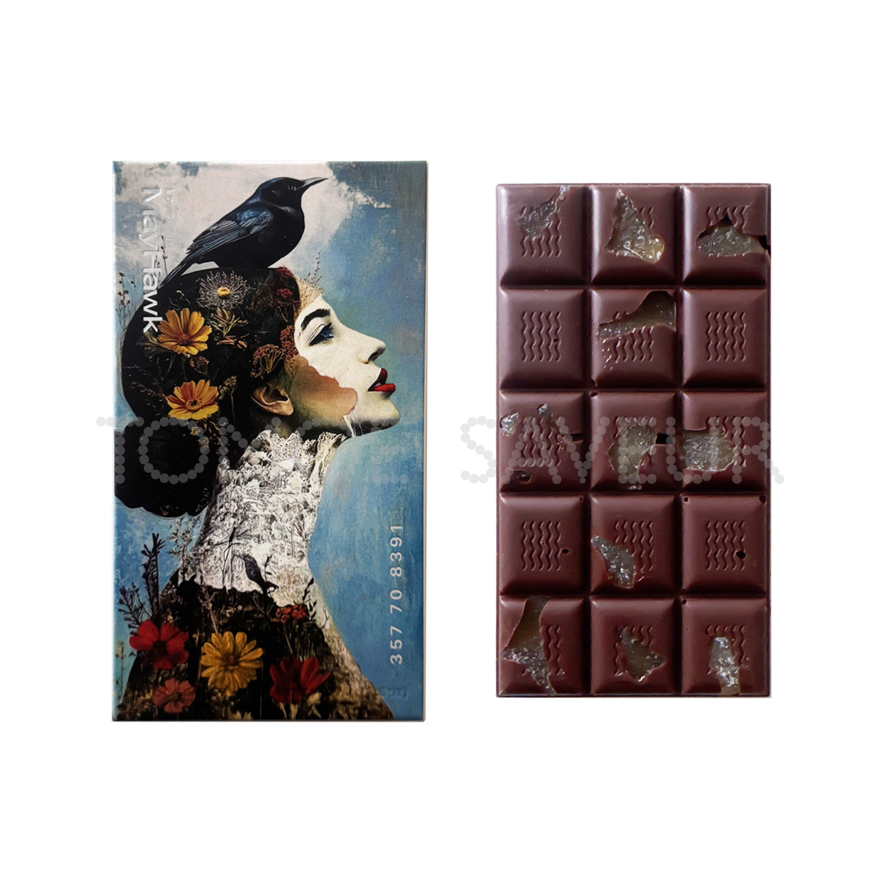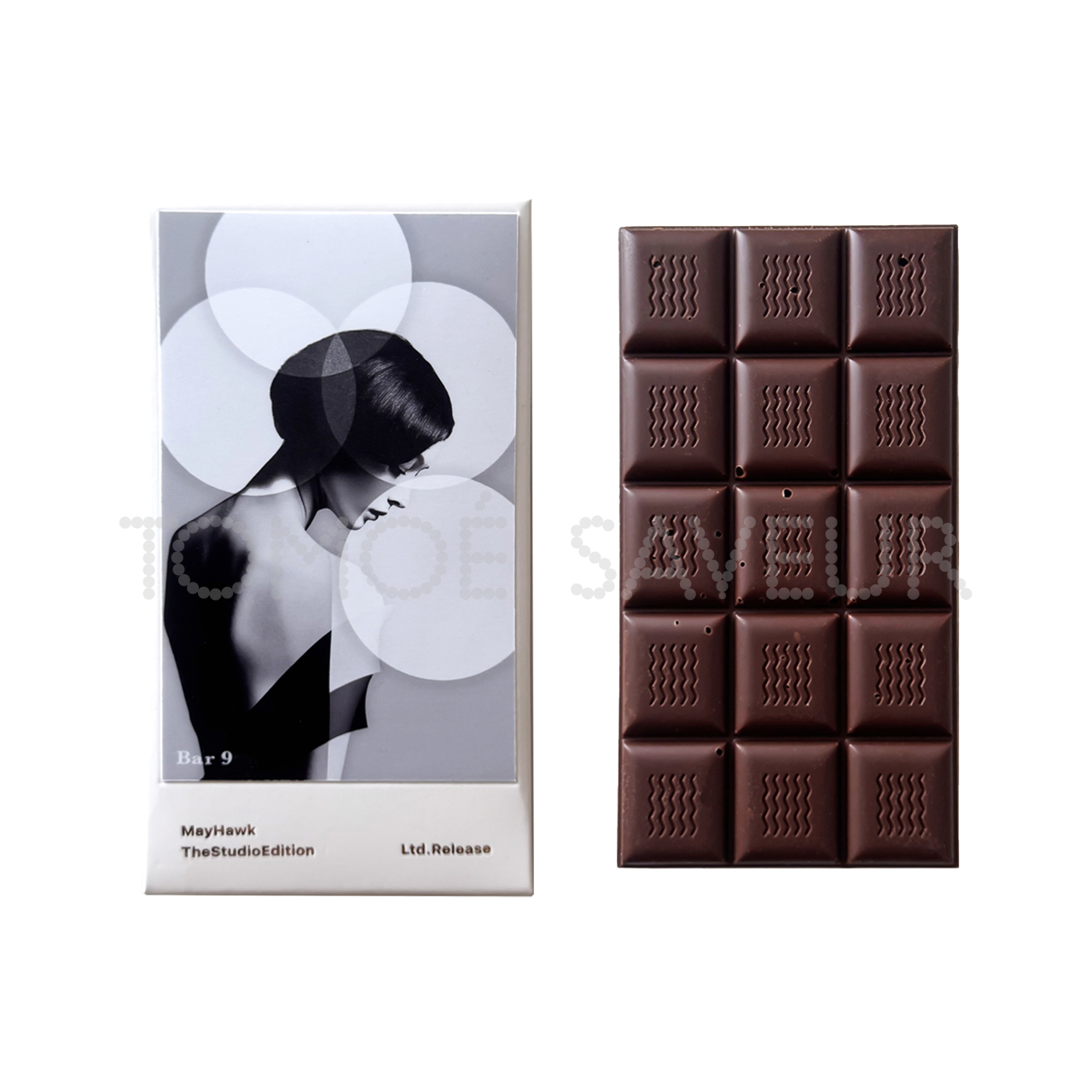 チョコレート職人になる前、創業者のコナーさんはプロの写真家でした。彼はこの限定バーのために、印象的な白黒ポートレートを用いました。シンプルさこそが鍵であり、色を加えることはむしろ邪魔になると考え、層と構図のみで作品を構築しています。人物の周囲に配置された白い円は、半透明の濃淡とコントラストによって緊張感を生み出すために加えられました。この緊張感は、「円相(えんそう:完全性)」と「無(む)」の両方を象徴しています。