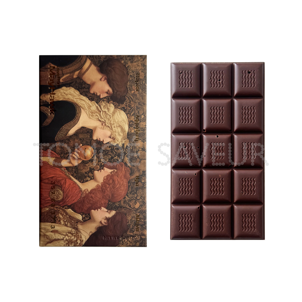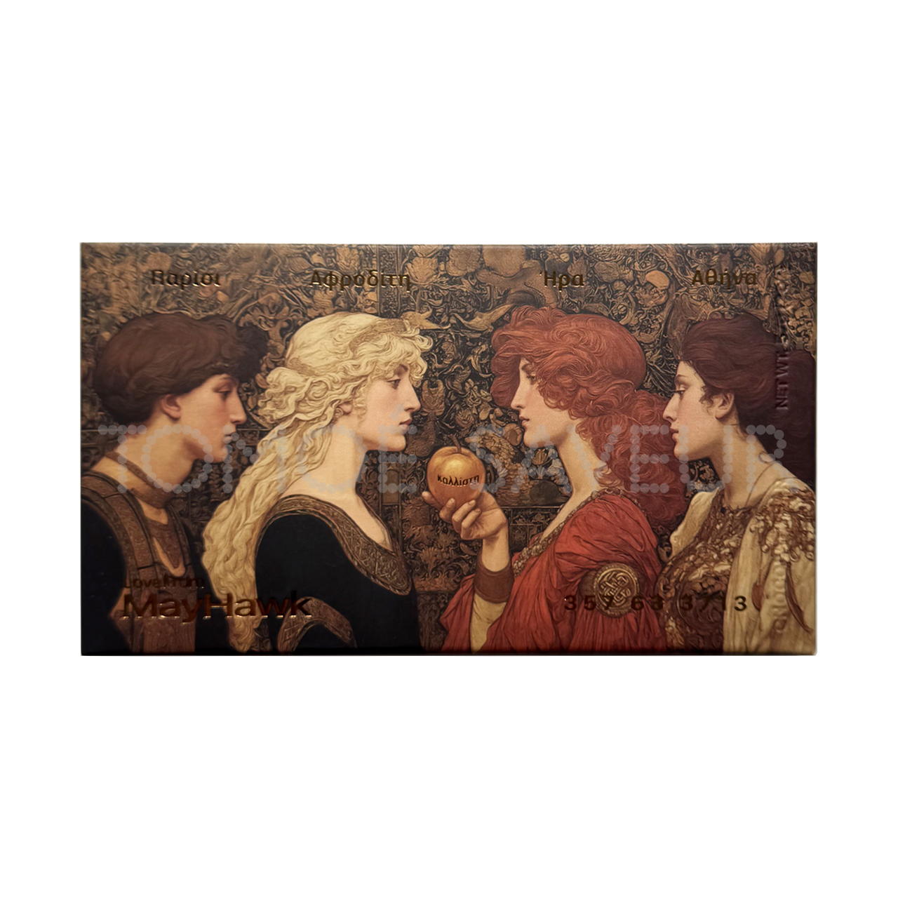 この伝説と、ヴィクトリア期のロマン主義/ラファエル前派の様式を研究し、金文字をあしらった構成に仕上げました。箱の絵をよく見ると、リンゴや登場人物の名前に正しいギリシャ語が使われています。