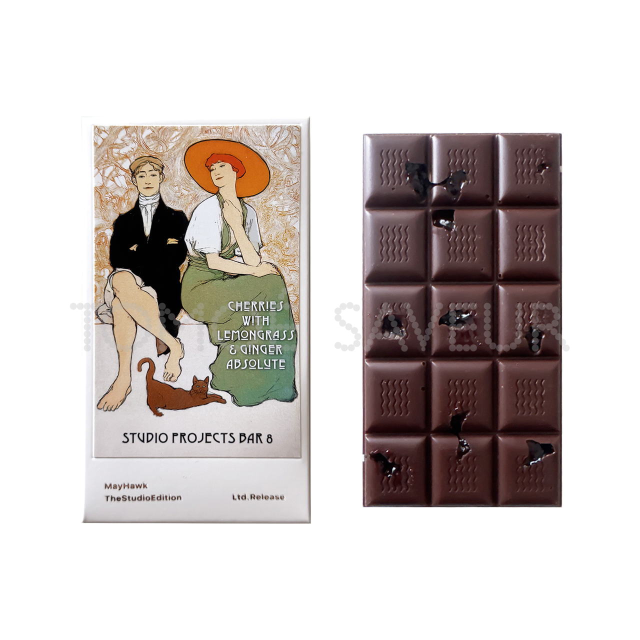 チョコレートのベースは、オリーブオイルを用いた “Olive Oil Absolute” 製法によるもので、今回はレモングラス、ショウガの根、カルダモンを加えて香りづけをしています。