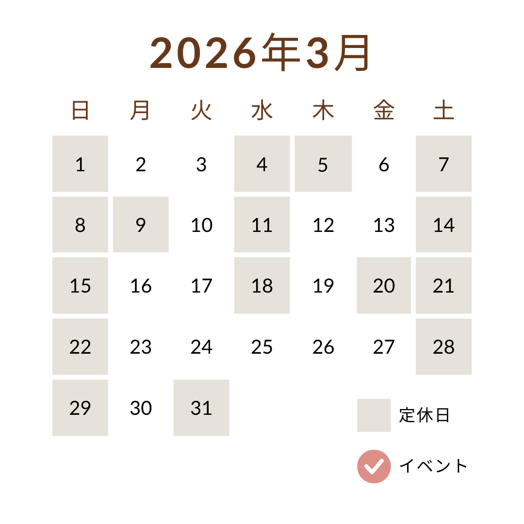(※諸事情により休業日が変更になる場合がございます。変更の際は、各種SNS等で改めてお知らせいたします。)